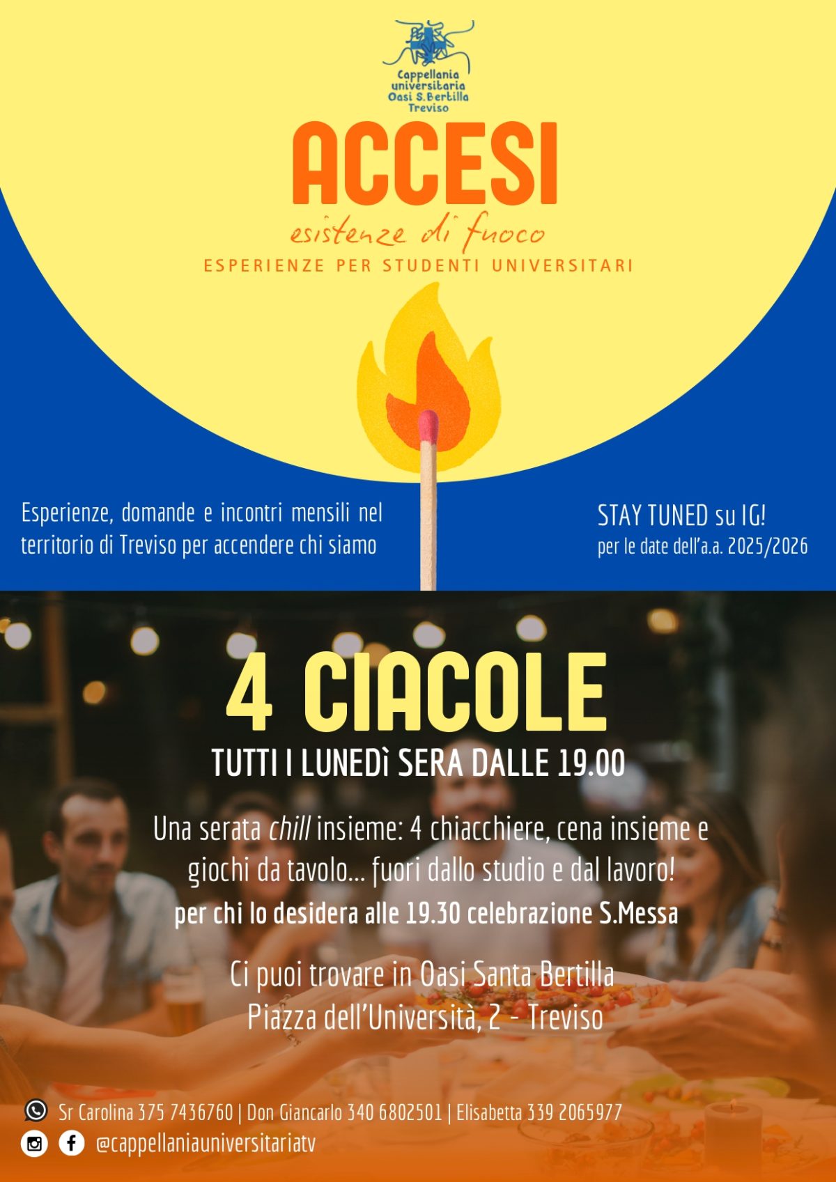 1. 4 Ciaccole: il lunedì sera, dalle ore 19.00, gli studenti si incontrano per un momento di scambio culturale, per celebrare la Messa, condividere la cena e vivere un tempo di fraternità (vedi allegato).